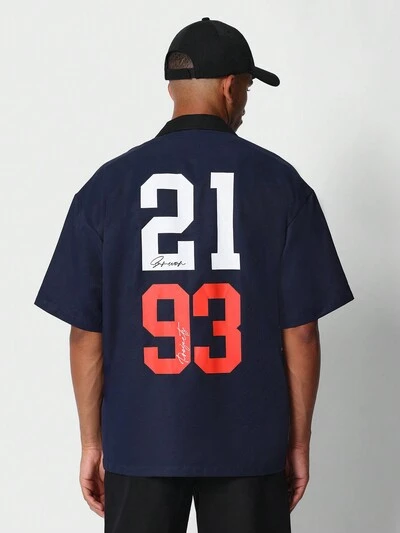 번호 프린트가 있는 렉시 컬러 블록 버튼 셔츠, 편안한 핏-45%