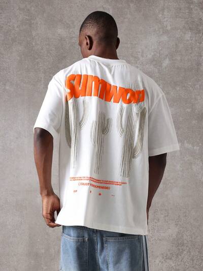코튼 오버사이즈 사막 선인장 프린트 그래픽 티셔츠-20%