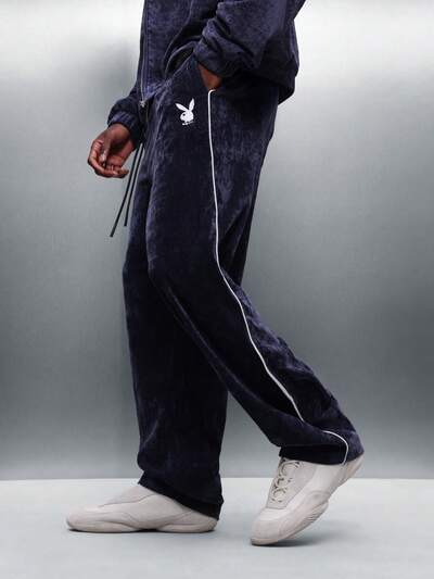 PLAYBOY X SUMWON Velour Sweatpants With White Piping DetailWhite Short Sleeve Button Shirt With Contrast Stitching