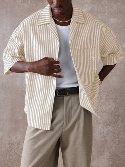Men's Long Sleeve Crop Fit Striped Button Up Shirt With Open Collar For Spring Summer Casual Wear-15%