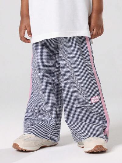 Spodnie z szerokimi nogawkami w kratkę i różowym paskiem po bokach