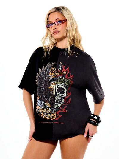 SUMWON WOMEN Koszulka bawełniana o luźnym kroju, z krótkim rękawem i okrągłym dekoltem, z nadrukiem czaszki motocyklowej i orła, w stylu oversize