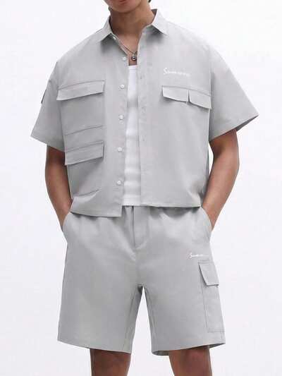 Beżowy, luźny komplet składający się z koszuli z krótkim rękawem i pasujących szortów z zapięciem na guziki z przodu i elastyczną talią. Letni, swobodny, dwuczęściowy strój