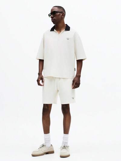 Męski, luźny komplet z koszulą zapinaną na guziki i pasującymi do niej spodenkami ze ściągaczem, dwuczęściowy, z białym kontrastowym wykończeniemKomplet: koszula i spodenki z teksturą