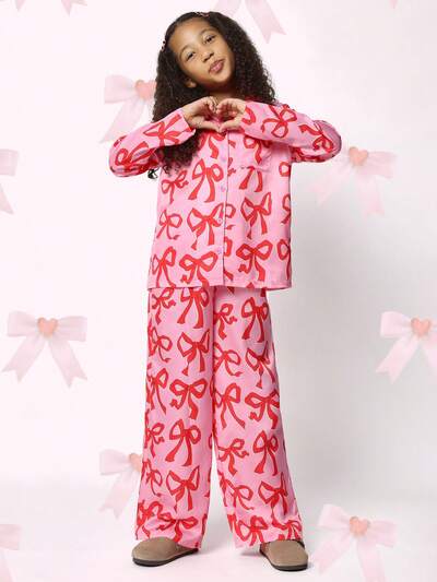 Komplet piżamowy z satyny z nadrukiem kokardki i zapięciem na guziki-50%