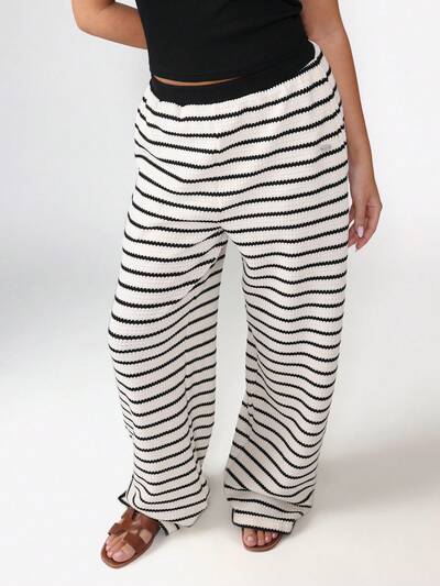 Szerokie nogawki dzianinowe spodnie z poziomymi paskami-25%