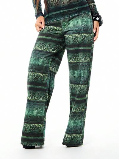 SUMWON WOMEN Damskie spodnie palazzo z wysokim stanem i szerokimi nogawkami w kolorze zielonym ze zwierzęcym wzorem, modne jesienią i zimą-50%