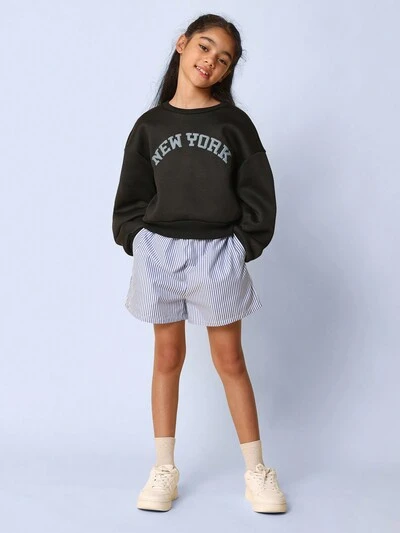 Zestaw dla dziewcząt Tween Girls Everyday Play z bluzą z okrągłym dekoltem New Yord z nadrukiem i krótkimi spodenkami w prążki, składający się z 2 części