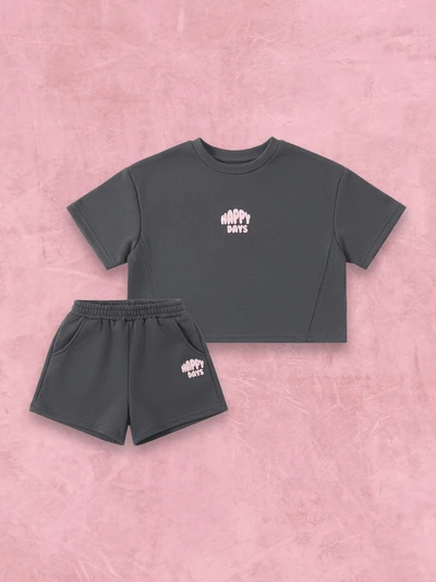 Dziewczęcy miękki komplet z nadrukiem tekstowym Happy Days, luźnym, krótkim topem i pasującymi szortami. Swobodny strój na lato i wiosnę.-10%