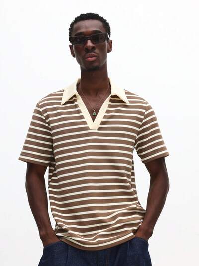 Elliot Teksturowany geometryczny elegancki polo z krótkim rękawem i kołnierzykiem, biznesowy, swobodny, beżowy dzianinowy top, letni, wiosenny, profesjonalny, do pracy w biurze
