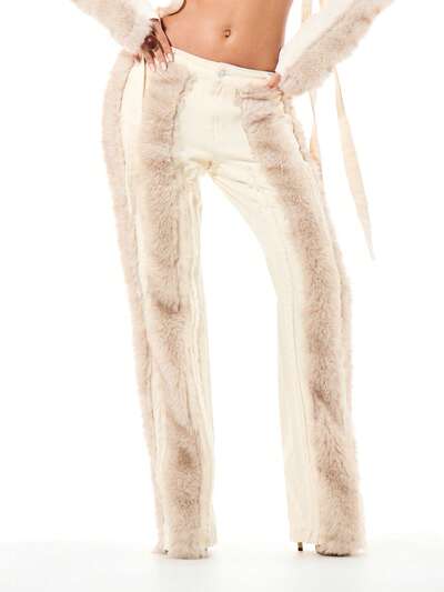 SUMWON WOMEN Kremowe jeansy z wysokim stanem i obszyciem z futra, z luksusowymi bocznymi panelami ze sztucznego futra i szerokimi nogawkami na jesień i zimę