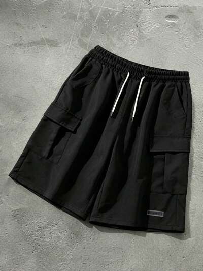 Męskie luźne szorty cargo z kieszeniami bocznymi i markową metką, letnie, swobodne spodnie