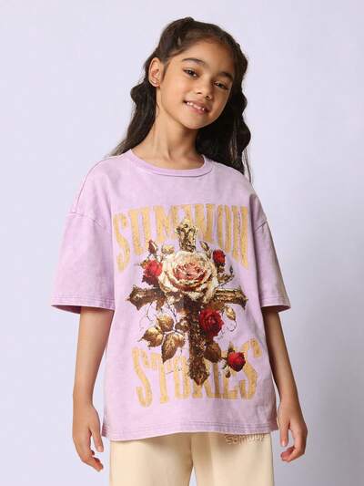 Luźna koszulka z nadrukiem w kwiaty i złotymi napisami