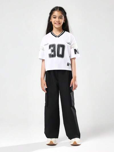 Koszulka z krótkim rękawem, koronkową wstawką i nadrukowanym numerem drużyny uniwersyteckiej-35%
