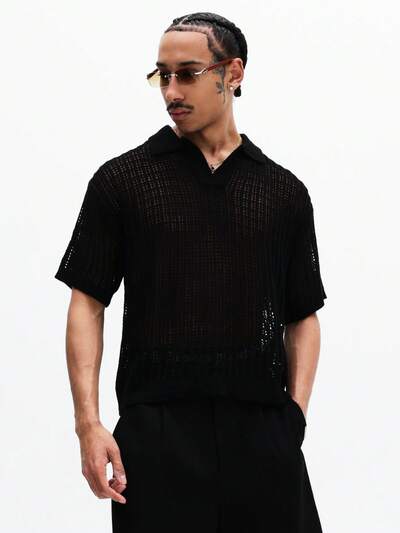 Ażurowa dzianinowa koszulka polo z kontrastową lamówką