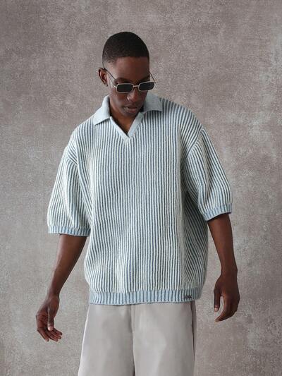 Koszulka polo z prążkowanej dzianiny w stylu vintage z krótkim rękawem i kołnierzykiem. Klasyczny styl retro. Codzienny letni strój na co dzień.