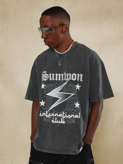 Koszulka Vintage Wash Oversized Lucky Charm Graphic T-Shirt w irlandzkim stylu, z nadrukiem studyjnym, dekoracyjną obwódką, na co dzień i na dzień Świętego Patryka, z luźnym stylem ulicznym, na festiwal Lucky
