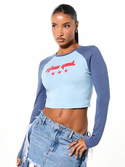 SUMWON WOMEN Top Feminina de Manga Longa Raglan com Design Colorblock e Detalhes de Estampa Gráfica-30%