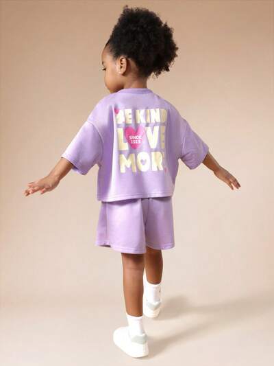 Conjunto de Camiseta de Manga Curta e Shorts Combinando com Estampa de Coração Fofa Oversized para Meninas, Roupas de Verão Casuais, Gola Careca, Amarelo Brilhante, Conjunto Coordenado de Duas Peças para Crianças