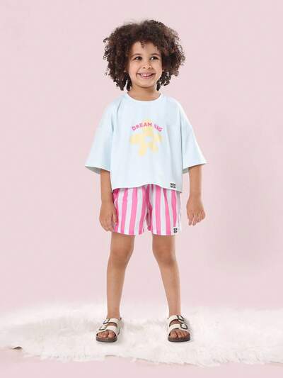 Conjunto Casual de Camiseta e Shorts com Estampa "Dias de Praia de Verão para Meninas" com Mangas Curtas e Gola Careca