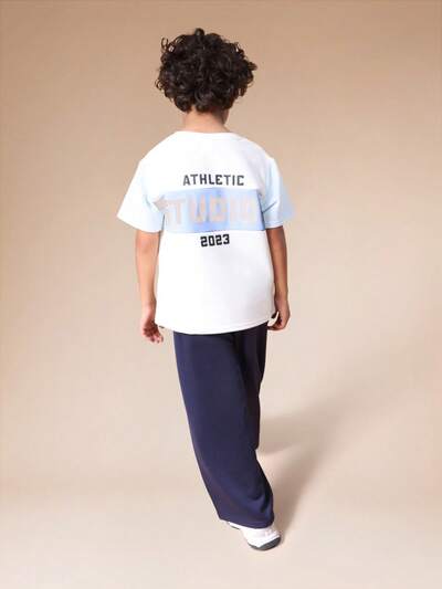 Conjunto Coordenado de Verão para Meninos, Camiseta com Costura Contrastante, Calça Jogger, Roupa Casual