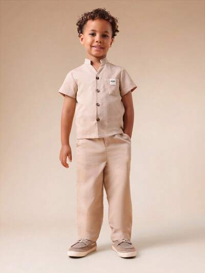 Conjunto de camisa e calça com toque de linho e gola mandarim.