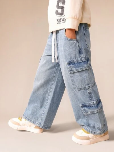 Calças Denim Cargo com Pernas Largas e Múltiplos Bolsos, Denim Azul Claro, Calças Casuais Estilo Streetwear para Meninos-45%