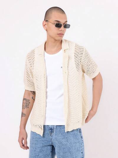 Camisa leve de crochê com botões e manga curta-50%