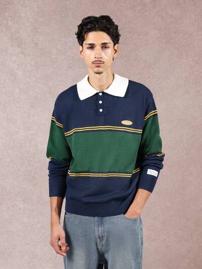 Suéter polo de malha com blocos de cores e gola contrastante-20%