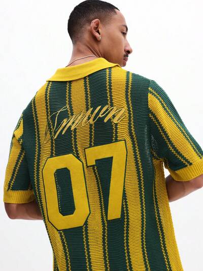 Camisa Polo de Malha Listrada de Ajuste Regular com Bordado do Número 07 na Parte de Trás, Manga Curta, Gola Casual para Verão-50%