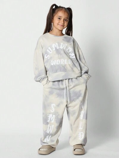 Conjunto de 2 peças com Moletom e Calça de Moletom Estampada em Tie Dye Confortável e Ajuste Regular com Estampa Gráfica para Meninas Pré-Adolescentes