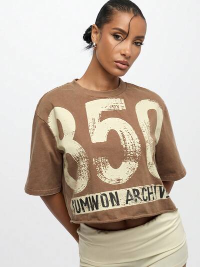 SUMWON WOMEN Camiseta de Bebê Estampada com Costura Overloque de Mangas Curtas Estilo Urbano