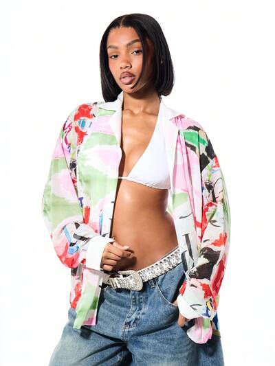 SUMWON WOMEN Kimono Camisa Capa Leve de Verão para Praia com Estampa Aquarela Abstrata Oversized de Frente Aberta-50%