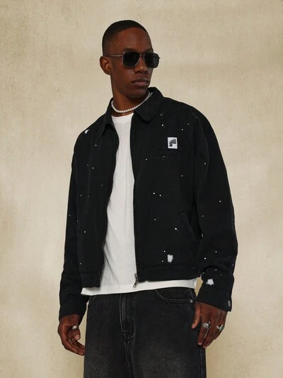 Jaqueta Trucker Denim Galaxy Desgastada com Respingos de Tinta