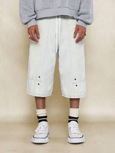Calça Denim larga com listras laterais e zíper de nylon