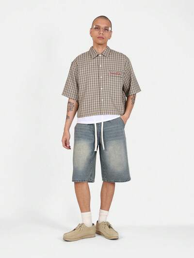 Camisa curta xadrez com botões e manga curtaCamisa de linho oversized com botões e gola pontiaguda