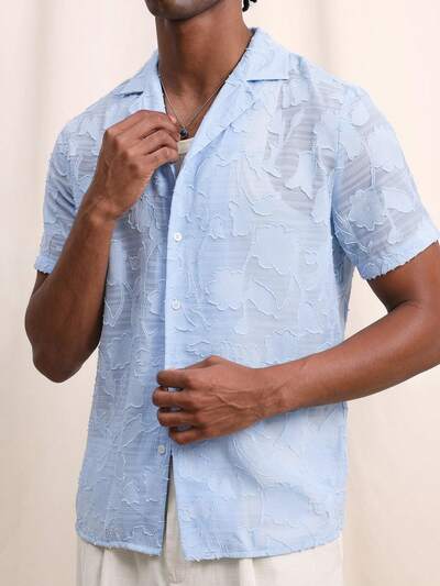 Camisa Social de Manga Curta com Botões e Gola Apontada, Ajuste Regular, Texturizada, Azul Claro, Casual de VerãoCamisa de beisebol listrada com zíper frontal