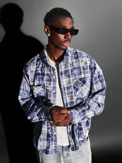 Camisa de flanela xadrez desgastada com botões e bolsos no peito-50%