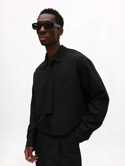 Camisa cropped risca de giz com gravata embutidaCamisa de manga comprida com gola e botões.