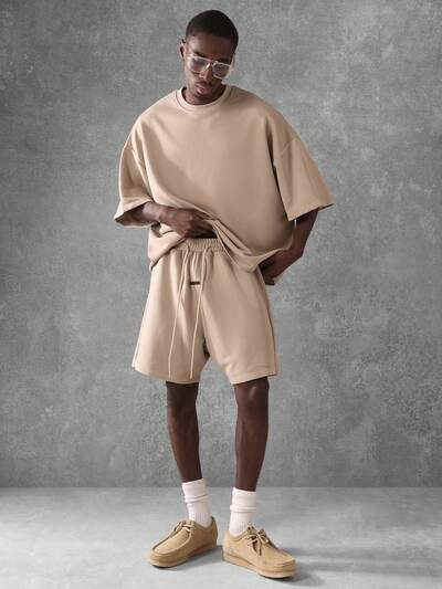 Camiseta masculina oversized e básicaConjunto coordenado de camiseta e shorts em camurça sintética