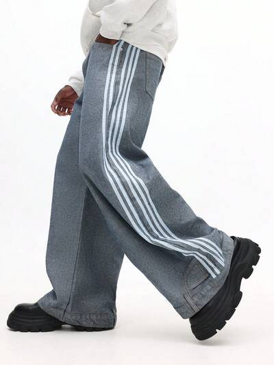 Calça Denim Larga com Listras Laterais
