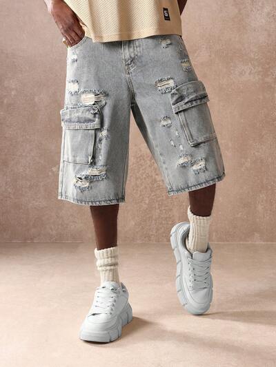 Shorts Denim largos e desgastados estilo carpinteiro-40%