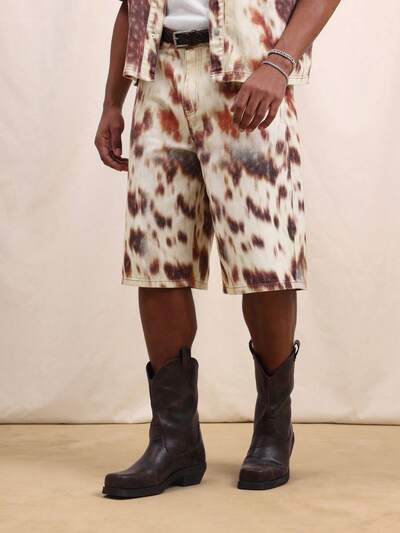 Shorts Denim de algodão com estampa dálmata, corte solto, perna larga e cordão na cintura