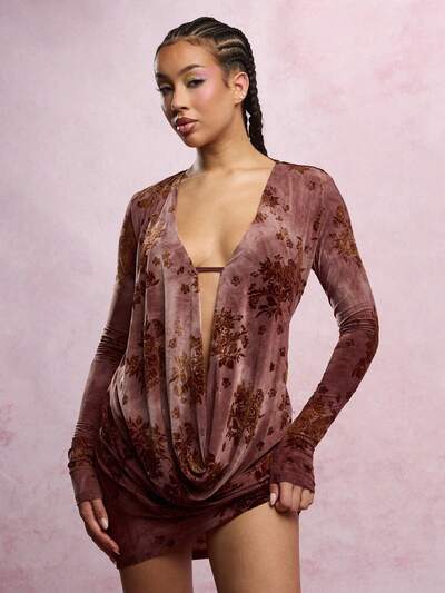 SUMWON WOMEN Vestido curto floral de veludo com decote profundo e manga comprida sem costasSUMWON WOMEN Vestido curto de camurça com acabamento em pele sintética e gola alta.