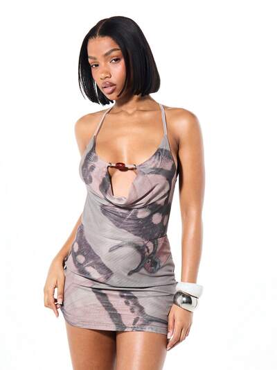 SUMWON WOMEN Vestido Mini Halter com Estampa Abstrata, Detalhe de Contas Marrons, Costas Abertas, Modelagem Colada, Tecido Elástico, Roupa de Festa, Clube e Ocasião, Vestimenta de Verão para a Noite